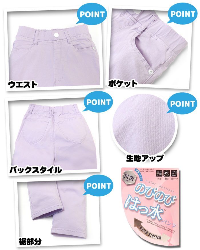 抗菌やはっ水 加工、動きやすいストレッチ素材で 履きやすい!通学時やお出かけなど さまざまなシーンで大活躍です。