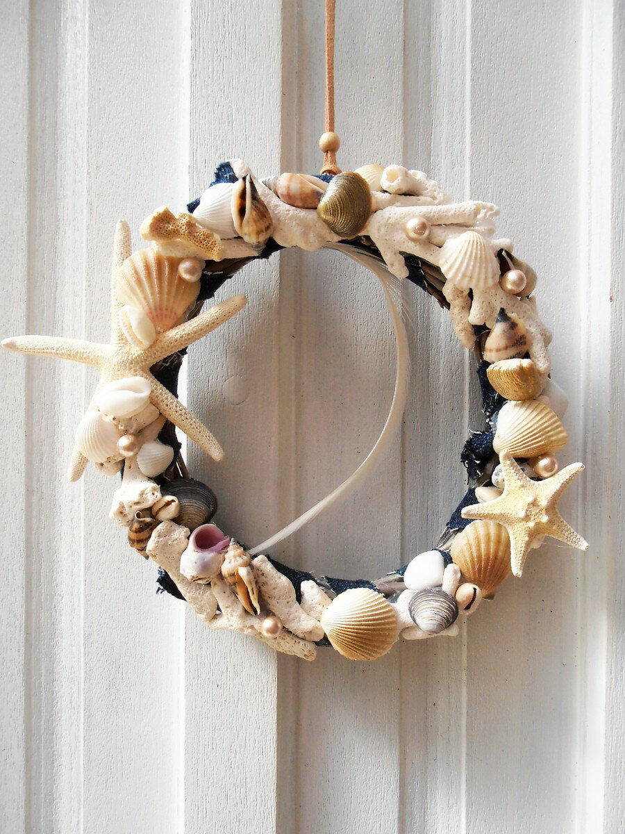 ナチュラルインテリアにぴったりな白スモーキーウッドにデニムベースのリースに白いサンゴ、色々な貝殻、スターフィッシュがデコレーションされています。